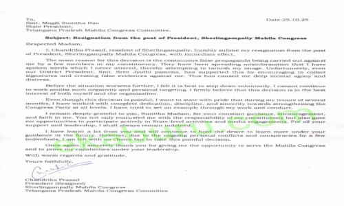 మహిళా కాంగ్రెస్ జిల్లా అధ్యక్షురాలు శ్రీ జ్యోతి పామన సైతం ఈ ప్రచారాన్ని నమ్మి తనకు వ్యతిరేకంగా సంతకాల సేకరణ, నకిలీ ఆధారాలను సేకరిస్తున్నారని వాపోయారు. ఇటువంటి వ్యక్తిగత దాడి చేస్తున్న పరిస్థితుల్లో తాను మానసికంగా ఇబ్బందులు పడుతున్నానని, ఈ పరిస్థితుల్లో నియోజకవర్గం మహిళా కాంగ్రెస్ అధ్యక్షురాలిగా కొనసాగడం ఇష్టం లేక తన పదవికి రాజీనామా చేస్తున్నట్లు లేఖలో తెలిపారు. శేరిలింగంపల్లి మహిళా కాంగ్రెస్ అధ్యక్షురాలిగా ఉన్న సమయంలో తనకు అండగా నిలిచిన రాష్ట్ర అధ్యక్షురాలు సునీత, మహిళా కాంగ్రెస్ సభ్యులకు కృతజ్ఞతలు తెలిపారు.