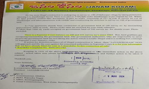 సర్వే నెంబర్ 66/A పేరుతో సర్వే నెంబర్ 100,101లోని ప్రభుత్వ భూములను కబ్జా చేస్తున్నారని, జీహెచ్ఎంసీ సైతం సదరు కబ్జా భూములకు అనుమతులు మంజూరు చేయడంతో ప్రస్తుతం నిర్మాణాలు జరుగుతున్నాయని అన్నారు. హెచ్ఎండీఏ ఆధీనంలో ఉన్న సర్వే నెంబర్ 100,101లలోని ప్రభుత్వ భూముల కబ్జాలను అరికట్టి, రక్షించాలని హెచ్ఎండీఏ కమీషనర్ దానకిషోర్ కు, ఐఏఎస్ అమ్రపాలికి, రాజేంద్రనగర్ ఆర్డీఓ, వెస్ట్ జోన్ జోనల్ కమీషనర్, శేరిలింగంపల్లి తహసీల్దార్ లకు ఫిర్యాదు చేసినట్టు తెలిపారు. ప్రభుత్వ భూముల కబ్జాపై అధికారులు చర్యలు తీసుకోకపోతే సుప్రీంకోర్టు, లోకాయుక్త దృష్టికి తీసుకెళ్తామని భాస్కరరెడ్డి హెచ్చరించారు.